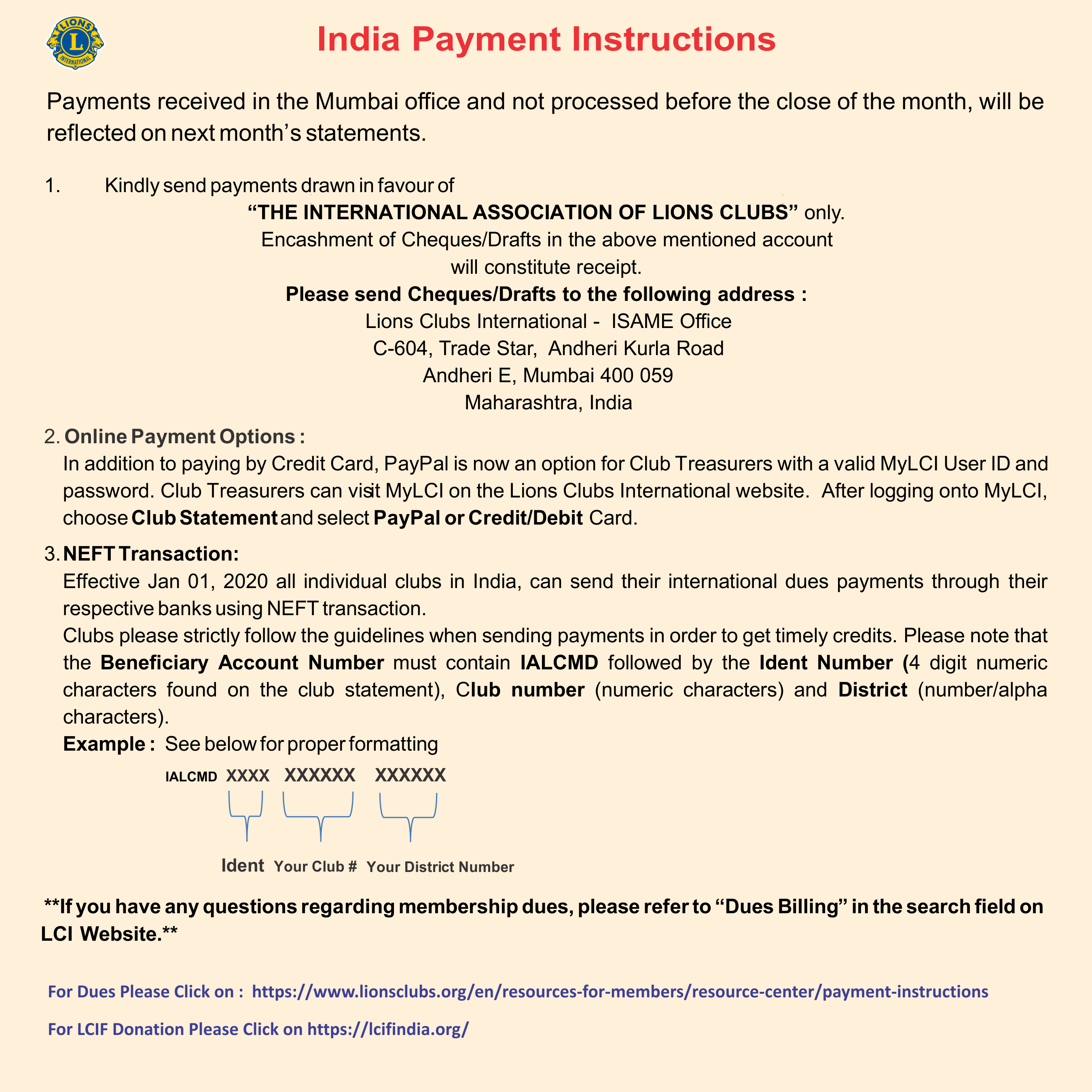 • NEFT Payment Details