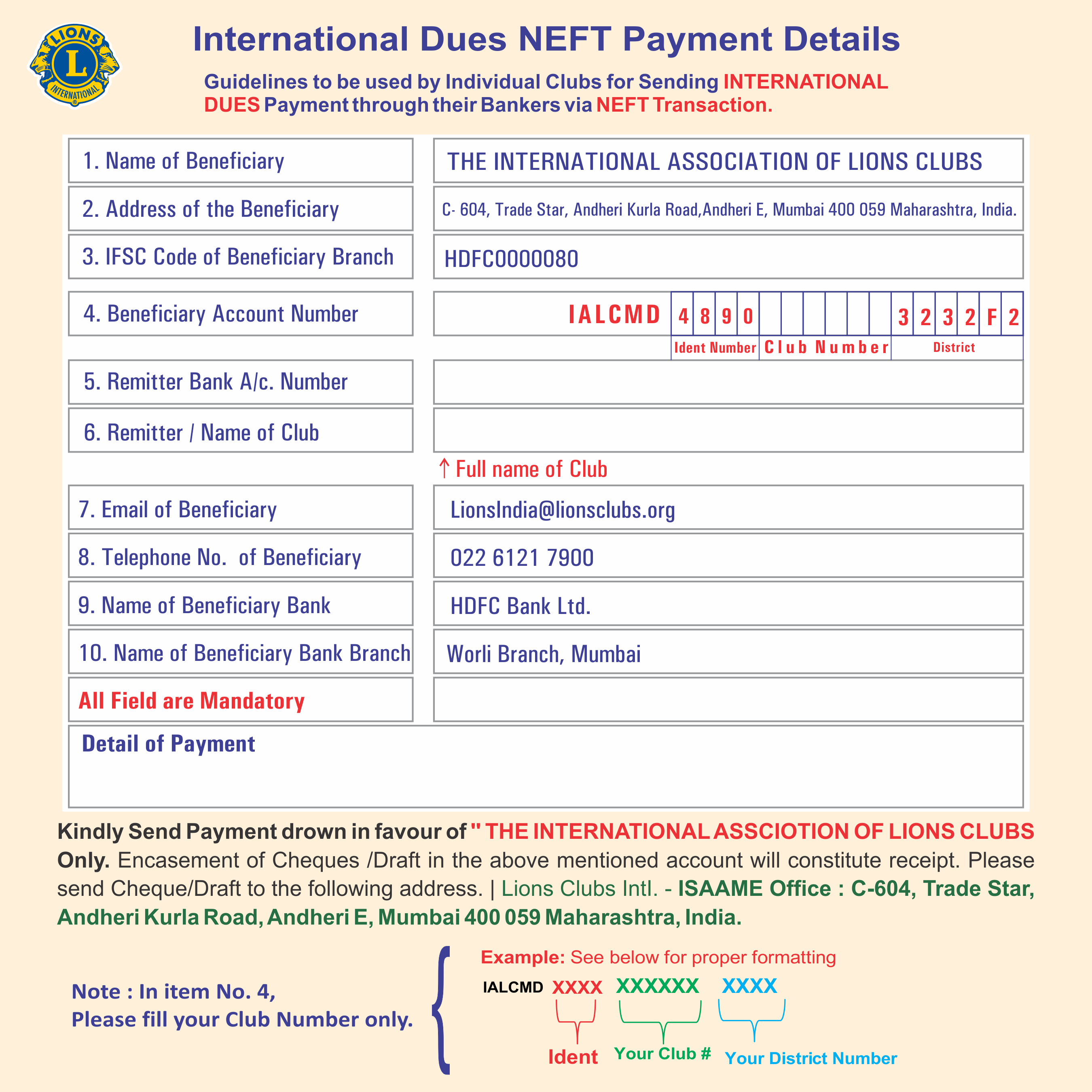 A/C Name : LIONS CLUBS INTERNATIONAL DISTRICT 3232 F2